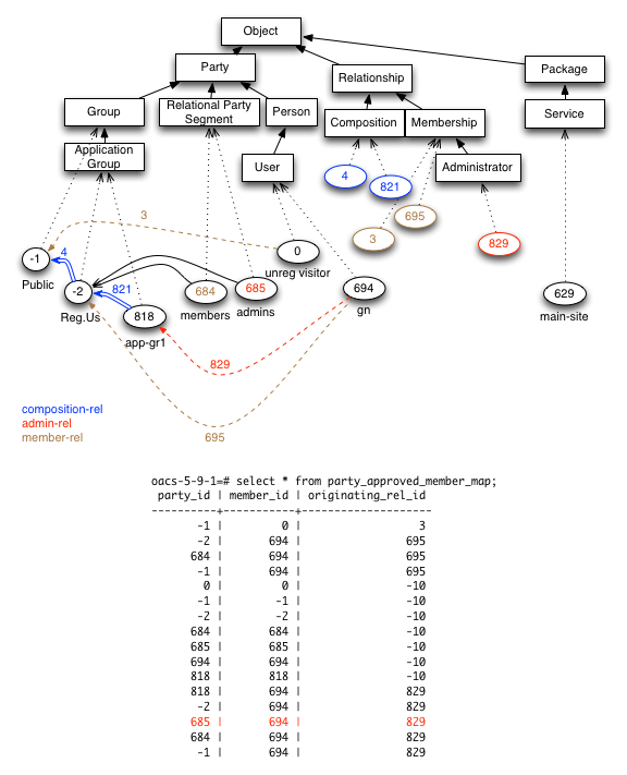 The following graph shows a small site with a user "gn" (494), the predefined groups ("the public" and "registered users") and a sample group "app-gr1" (818). In addition, there is a relational segment for the members of registered users (684) and a relational segment for the "admins of registered users" (685). When user gn (494) is added as admin of app-gr1 (admin rel 829), the user becomes automatically member of the relations segment of the parent group, "admins of Registered users" (685) and as well member of (684). Under the graph is a listing of the party_approved_member_map, where the membership in 685 is marked as red as well.